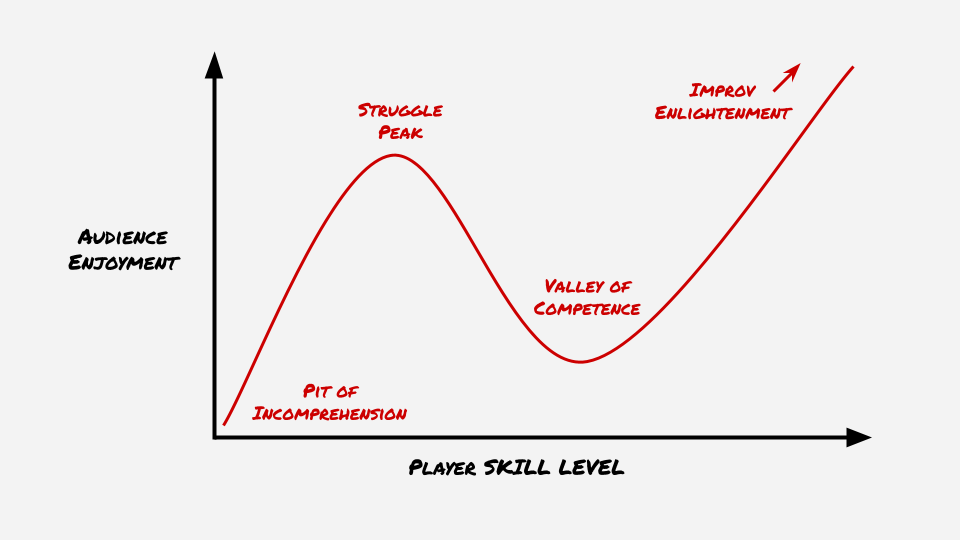 As you continue to improve, there are diminishing returns. Remember that the audience doesn't know how hard the game actually is, because they've probably never tried to do it themselves. If you get too good, you can make it look easy, and at this point, the gimmick loses its potency. Seeing a player be really good at remembering the alphabet is not as fun as seeing them frantically trying to think of the next letter. This is the Valley of Competence. Here are the three options to deal with it from worst to best:
